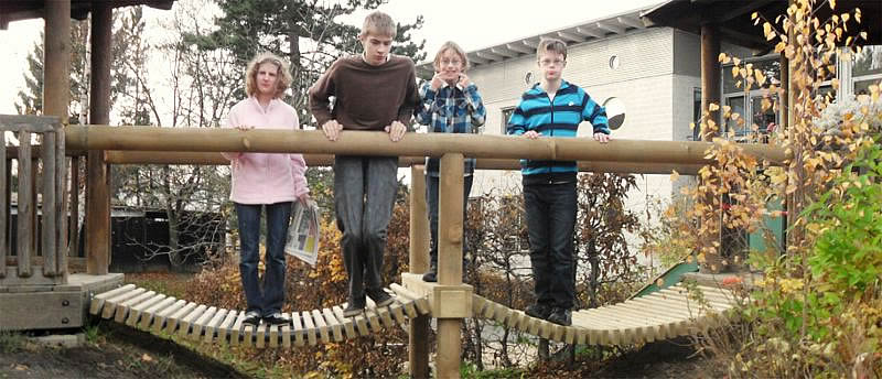 Eine neue Holzbrücke wurde auf dem Schulhof gebaut. Bald können wir wieder von einem Turm zum anderen Turm gehen.