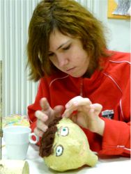 schiedliche Hauttöne zu erhalten. Jede Figur sollte einen ganz besonderen Gesichtsausdruck bekommen. Es sollten die Figuren Ronja, Mattis, Lovis, Borka-Räuber, Birk und Glatzen-Per in unserem Stück mitspielen. Am schwersten war es, die Augen und den Mund auf den Kopf zu malen.