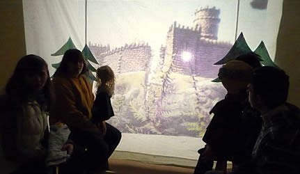 Vor einer großen Leinwand mit dem Foto der Mattis-Burg, haben wir dann "die Puppen tanzen lassen". Die einzelnen Szenen wurden mit einer Kamera aufgenommen. |