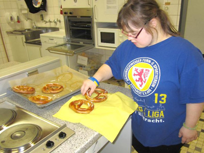 Außerdem stellen wir Apfelschorle selbst her, und wir backen Laugenbrezeln.