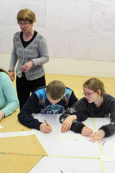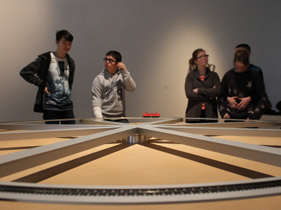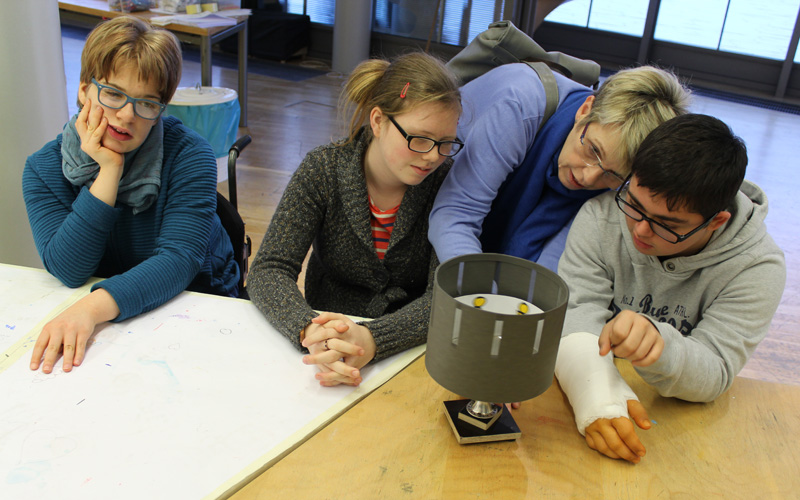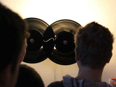 | Damit haben wir eigene Loops erstellt. Wir müssen unbedingt auch eigene Wundertrommeln bauen- die im Kunstmuseum waren aus einer Fahrradachse mit Kugellagern gefertigt. Das wollen wir auch machen. Aliana, Franzi, Olli und Frau Bock schauen sich das Zoetrop genau an. |