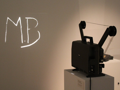 | Dieser Filmprojektor spielt einen kurzen Film immer wieder von vorne ab: eine Signatur MB erscheint und verschwindet. |