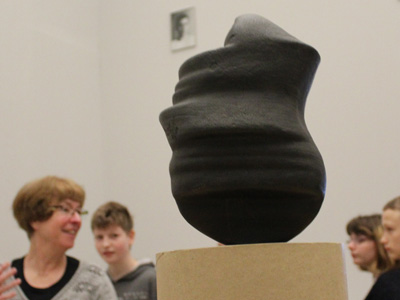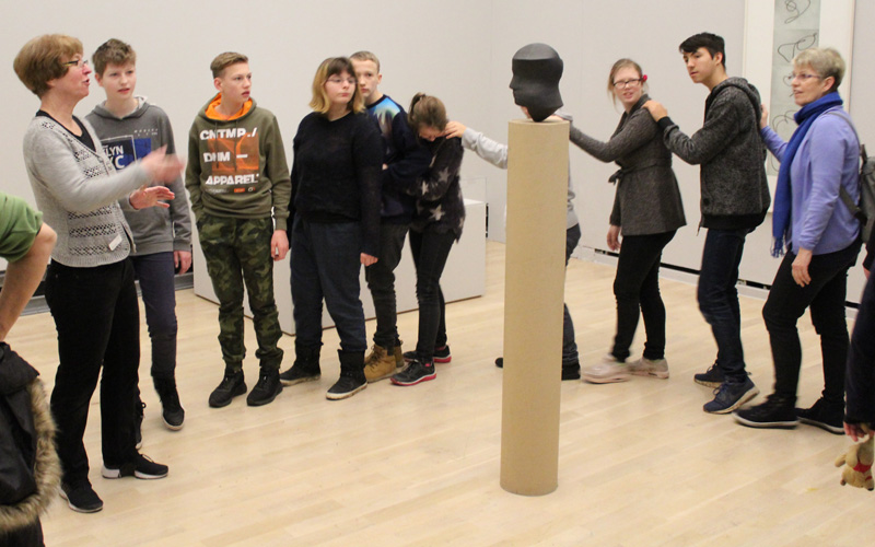 Wir gehen im Gänsemarsch um dieses Ausstellungsstück. Wer dabei gut aufpasst und genau hinschaut, sieht wie der Kopf Kopfstand macht und sich wieder umdreht. |
